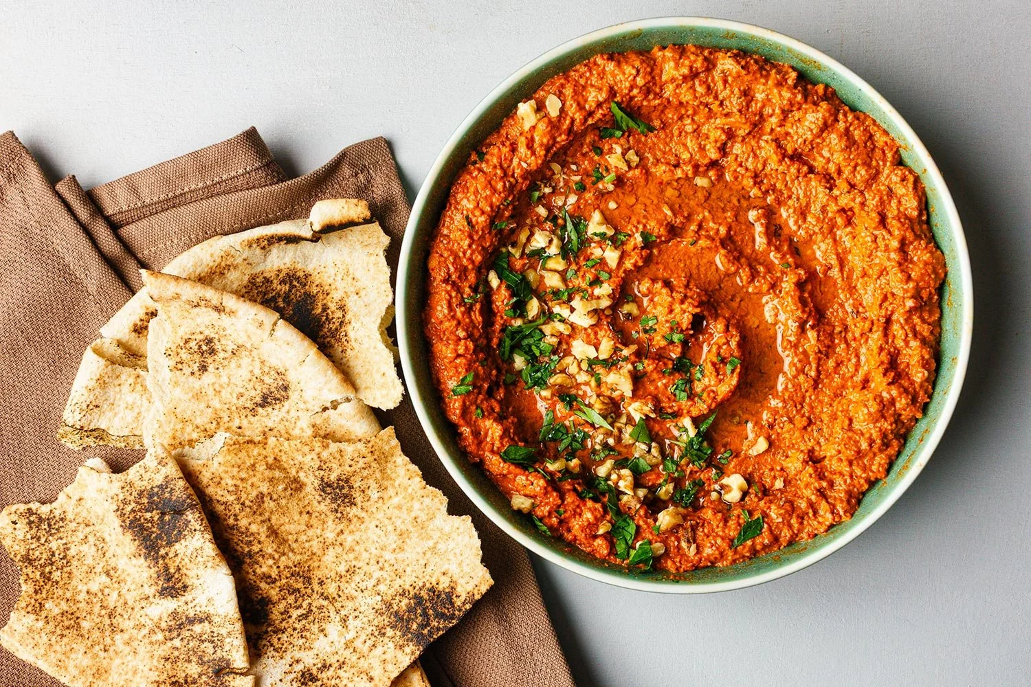 A staple of the mezze table, with roasted red peppers, walnuts and pomegranate molasses. It works as a dip with flatbreads and pickles, a sandwich spread or a sauce, delicious alongside grilled lamb or chicken.